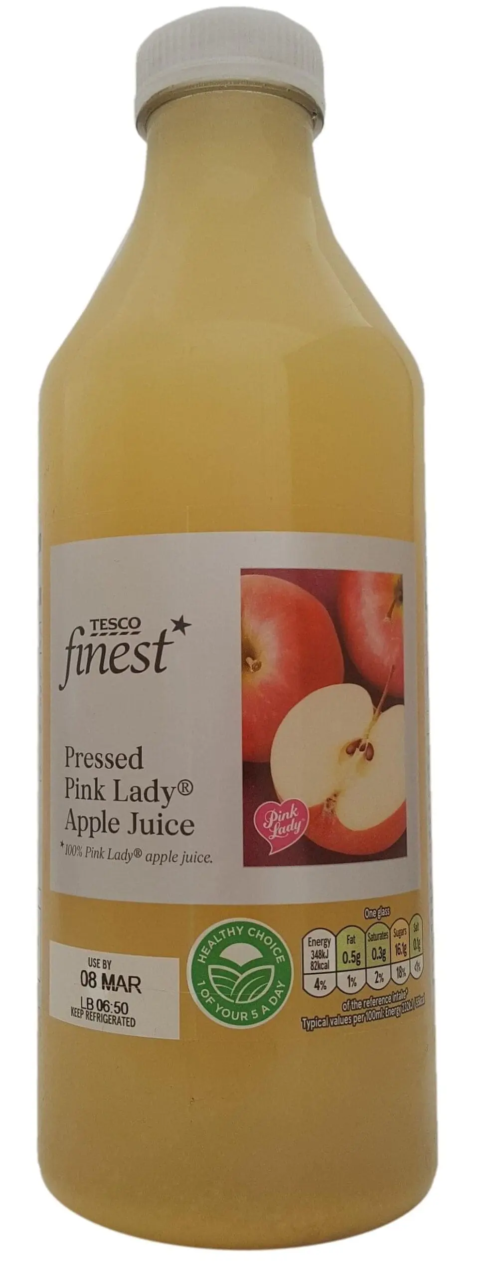Made with hand-picked, specially selected apples: Tesco Finest Pressed Pink Lady Apple Juice is said to be made with hand-picked, specially selected, sweet and aromatic Pink Lady apples that have been ripened by warm sunshine to give a sweet and refreshing flavour (UK).