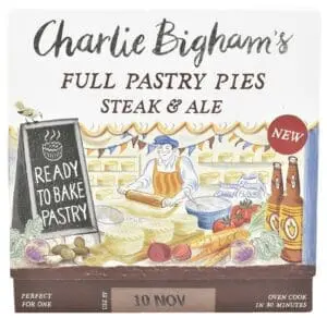 Charlie Bigham’s Steak and Ale Pie is ready to cook and part of a range of gourmet pies. It is made from tender British steak slow cooked with smooth ale and a shake of Worcestershire sauce, topped with light, flaky puff pastry.