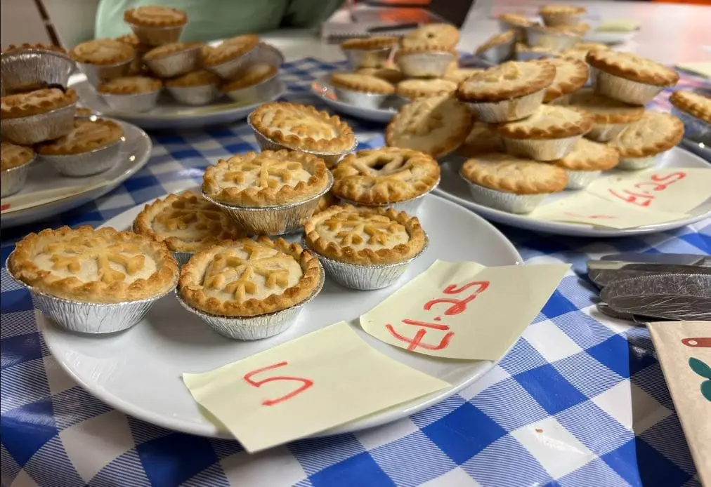 The pies were brutally cut up into bite-sized quarters by the tasters in a futile attempt to control sugar intake. Scores were debated and knives glinted and clanked on plates under the spotlights. Gradually, the noise level increased, provoked by rumours of number four’s aniseed aftertaste, three’s claggy base, and nutmeg being a potential hallucinogenic.