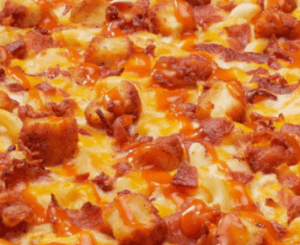 Creamy cheese sauce layered with macaroni noodles and topped with 100% real Wisconsin mozzarella cheese, cheddar cheese, buffalo chicken, applewood smoked bacon and drizzled with mild buffalo sauce.