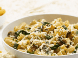 Cauliflower-infused rigatoni in light roasted garlic cream sauce with roasted zucchini, mushrooms and spinach finished with MontAmore cheese and parsley.