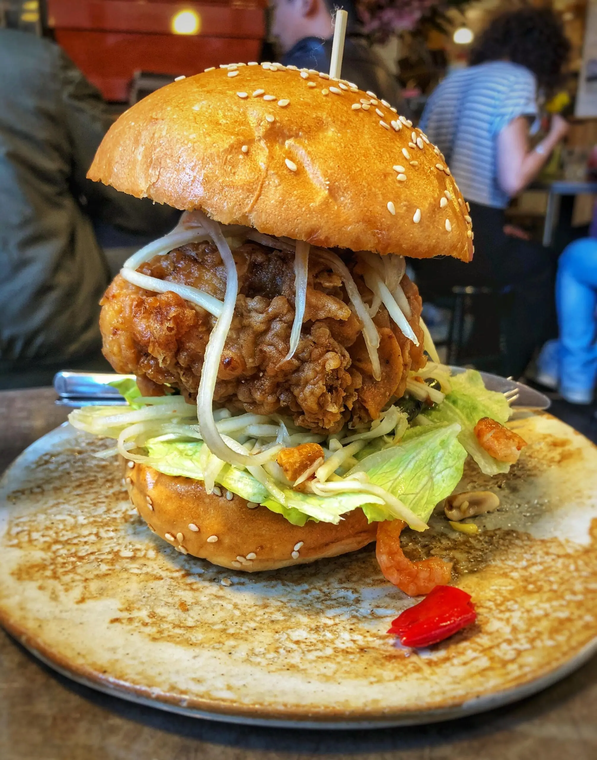 I recently travelled to Australia and New Zealand as part of a client roadshow and had the pleasure of eating many unforgettable dishes. One meal that stood up was in Sydney’s cafe Boon, situated inside a Thai grocery store. It serves up Thai flavours in new formats at lunchtime, before changing to a traditional menu in the evening – or as they put it ‘Sarnie’s by day and Isaan by night’. I tried the fried chicken burger topped with traditional thai green papaya salad from the daytime menu. This was no mean feat as the burger was huge! The chicken appeared to have been double fried as the batter was thick and crunchy, while the tangy papaya salad added a welcome touch of freshness and acidity. Interesting textures came from the addition of dried shrimp and peanuts, commonly used in Thai cuisine.