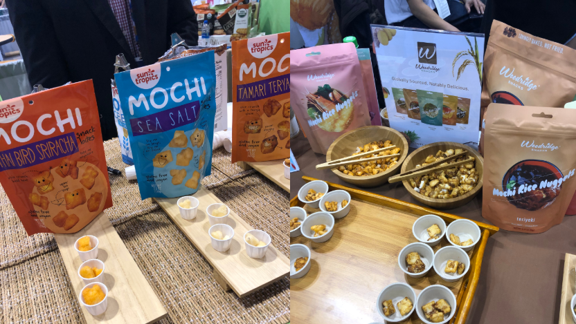 At this year’s Sweets & Snacks Expo I tried two brands of savory mochi snacks: Sun Tropics Mochi Snack Bites and Woodbridge Mochi Rice Nuggets. This was the first time I have seen mochi in a savory or crunchy format. The rice is dried and fried, instead of being kneaded into the traditional soft mochi format. Both products had a crunchy-yet-chewy texture and packed a punch of flavor. The texture and crunch lends itself to being an addictive salty snack and I think there are endless opportunities for flavor innovation.