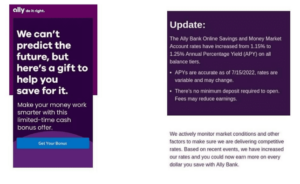 Following the cash bonus offer, Ally again emailed online savings account customers to announce its increased APY. In another attempt to provide support, the brand informed consumers that it closely monitors the market to provide the best rate possible.