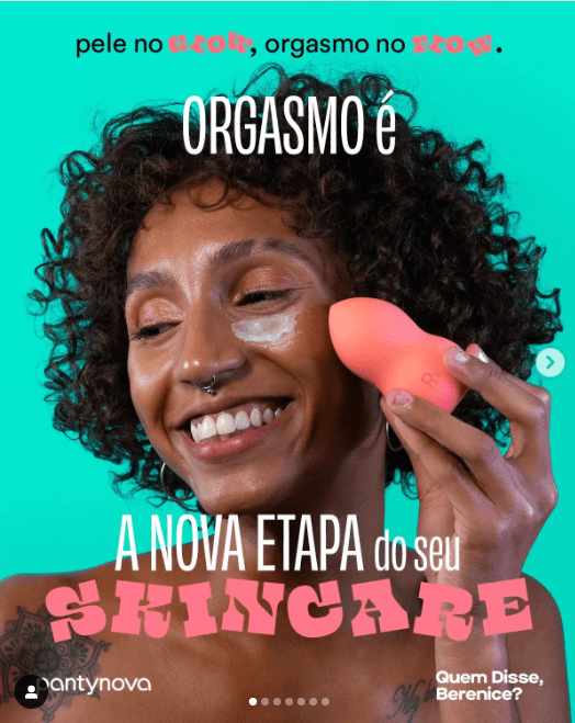 So bewerben beispielsweise das Kosmetikunternehmen Quem Disse, Berenice? und das Sexual-Wellness-Unternehmen Pantynova zusammen den Orgasmus als Hautpflegeschritt für strahlende Haut.