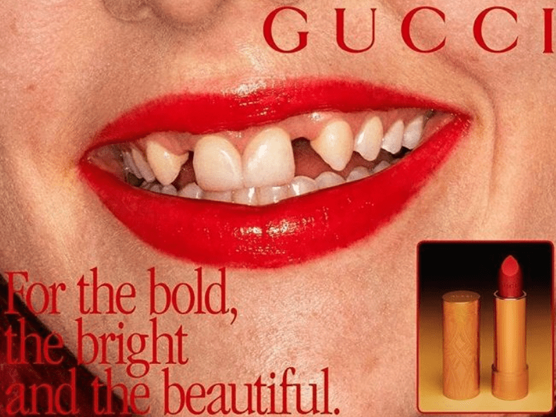 Bereits 2019 setzte Gucci mit der Neuauflage seiner Beauty-Linie hier neue Maßstäbe. Beworben wurde ein Lippenstift, aber die großen Zahnlücken von Model und Sängerin Dani Miller waren der eigentliche Star. In Deutschland trifft Gucci damit nach wie vor und vor allem bei jüngeren Zielgruppen einen Nerv, denn über ein Drittel der 16-24-Jährigen Deutschen wünscht sich aktuell mehr Darstellungen unperfekter Zähne in der Kosmetikwerbung.