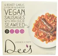 [row]Quorn Meat Free Fishless Fingers sind fischfreie pikante Stäbchen, die mit Mycoprotein hergestellt werden und mit einer knusprigen Kruste überzogen sind.Heck Super Greens Veggie Balls sind aus Quinoa, Spinat, Grünkohl und Ingwer hergestellt und eignen sich für Vegetarier und Veganer.Dee’s Roast Garlic & Porcini Mushroom Vegan Sausages with Irish Pulse Seaweed