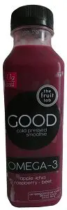 Der Omega-3 Cold Pressed Smoothie von The Fruit Lab Good (Niederlande) wurde aus Äpfeln, Chiasamen, Himbeeren und Rote Beete hergestellt. Durch die Kaltpressung bleiben dabei Nährstoffe, Geschmack und Frische der Zutaten erhalten. Da Chia-Samen eine natürliche Quelle für Omega-3-Fettsäuren sind, enthält somit jede Flasche 1,1 Gramm dieser Fettsäuren.