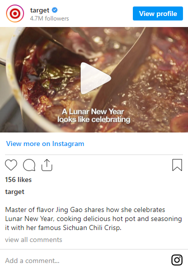 Seizing on cultural moments, Target created a series of YouTube videos for the Lunar New Year, which centered on storytelling and cultural appreciation through the preparation of different Asian cuisines that could then be circulated in paid social channels. One such campaign featured Jing Gao, renowned chef and founder of Fly By Jing, a brand of Sichuan Chili Crisp sold in Target stores, as she cooked hot pot and spoke to the importance of keeping culture and traditions alive. These campaigns were effective in making space for specific cuisines and cultures under the larger AAPI umbrella and avoiding the common pitfall of speaking to all Asian Americans as a monolith.