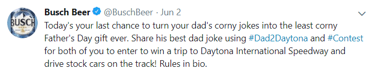 Busch Beer put a call out on social media for dad joke submissions for the chance to win a trip to Daytona International Speedway.
