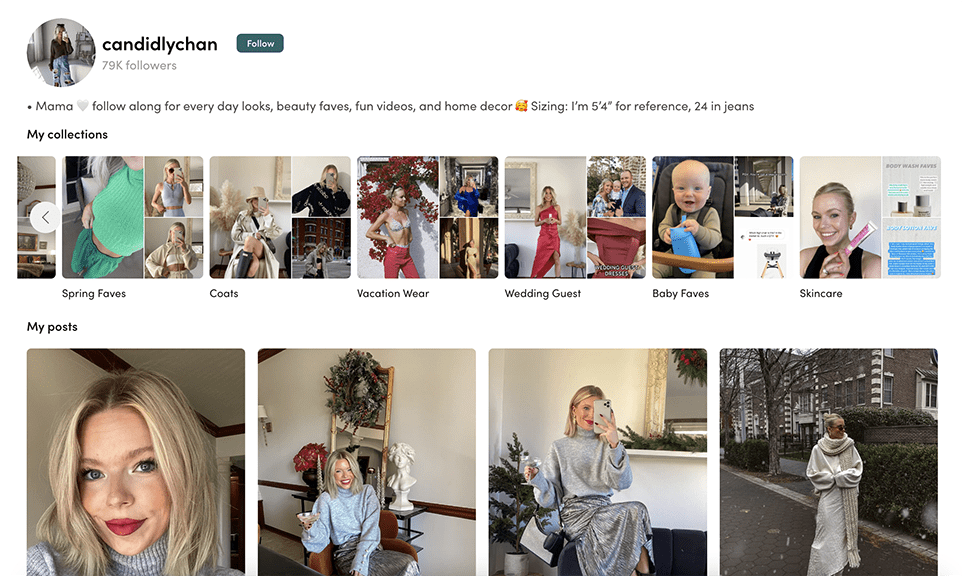 CandidlyChan, a lifestyle influencer, has a product recommendation section for “trending posts” and “vacation wear,” in addition to channel collections where consumers may have seen products. This organization provides a different type of path to purchase, initially organizing products by the occasion, look, or end result that consumers are researching, rather than just the product category itself.