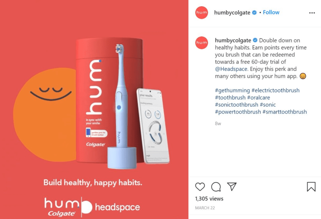 Hum by Colgate is proving value by syncing with consumers’ lifestyles. The smart toothbrush connects directly with the Apple Health app so users can have all their health information, including brushing habits, stored in one convenient location. Additionally, Hum offers a reward system to motivate daily brushing habits. In March 2021, the brand launched a partnership with Headspace where users can exchange brushing points for a 60-day free trial of the popular meditation app, showcasing Colgate’s support of consumers’ mental and physical wellbeing.