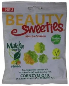 Beauty Sweeties Matcha-Sonnen (Matcha Suns) are described as fruit gums made with ingredients from natural sources including matcha green tea, fruits, co-enzyme Q10, aloe vera and biotin, and with 20% fruit juice. The vegan product consists of the following three flavours: Matcha & Orange; Matcha & Lemon; and Matcha & Apple. It is free from gluten, fat, lactose, animal gelatin, artificial flavours, preservatives and artificial colourings, and retails in a 125g pack bearing the Vegan V-Label seal from the European Vegetarian Union.