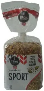 Sigdal Bakeri Knækbrød Sport (Sport Crispbread) is described as a Norwegian crispbread based on seeds, kernels and wholegrains, that’s perfect as a tasty snack alone or on the breakfast and dinner table with different types of cold cuts or with dips. The 100% natural and vegan product contains 45% seeds and kernels and 12.7% dietary fiber, and is said to be a source of protein.