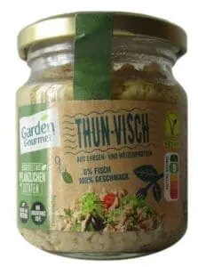 Garden Gourmet Thun-Visch aus Erbsen- und Weizenprotein (Tuna Substitute from Pea & Wheat Protein) is a tuna flavoured vegan product from pea protein and wheat protein, and is described as 0% fish with 100% flavour. It is made from plant-based ingredients with no preservatives, and is rich in protein. It can be consumed cold or warm in salads, wraps, sandwiches or pasta.