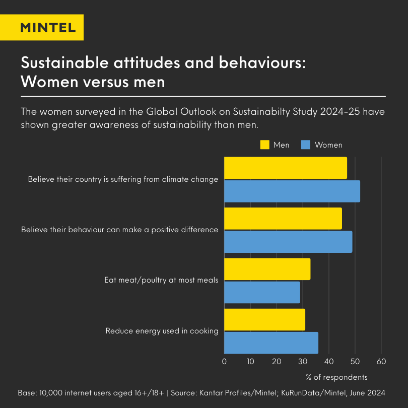 Our Global Sustainability Report 2024-25 acknowledges traditional concepts like “Mother Nature” and explores gendered perceptions that often depict certain groups as more conscientious, and key household consumers. The survey found that respondents who identify as women show a greater awareness of sustainability issues and are six percentage points less likely to deny climate change compared to those who identify as men. They are also more likely by five points to believe that their country is suffering from climate change and four points more likely to believe they can make a positive difference through sustainable behaviours.