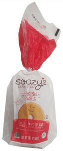 Soozy‘s Grain-Free Original Bagels are made with a blend of flours (from cassava, almond, flaxseed), tapioca starch and psyllium husk and are free from gluten, dairy, gums, soy, eggs, peanuts, GMOs and glyphosate residue (US).