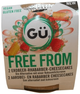 Gü Free From Strawberry & Rhubarb Cheesecake (vegan) is made with flour mix containing brown rice, potato starch and cornflour, and a base of vanilla-coconut milk cream and strawberry-rhubarb. (Germany)