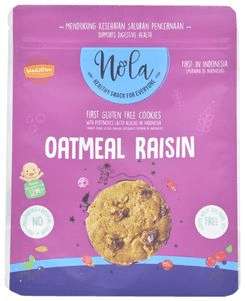 Nola’s Oatmeal Raisin Gluten Free Cookies with Postbiotic Lactobacillus contains red & brown rice, oats, chia and flax seeds and palm sugar. The product is claimed to support digestive health (Indonesia).
