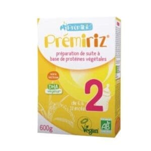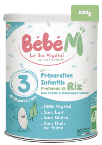 Bébé M Follow-On Formula is made from rice protein hydrolysates and manufactured using a cold process without palm oil. The infant formula contains EPA/DHA from marine algae (lithothamne, spirulina) (France).