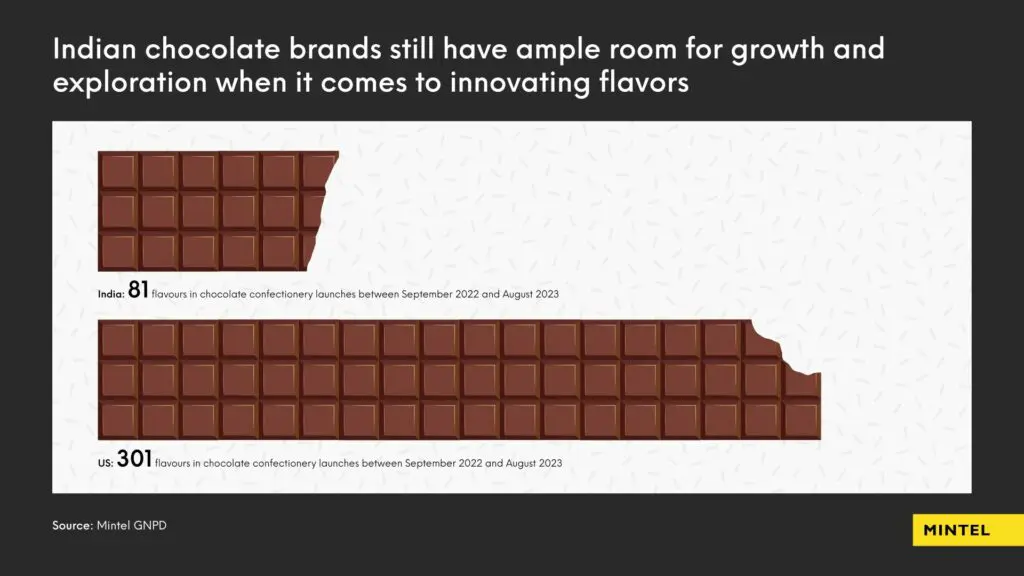 In recent years, chocolate consumption in India has seen significant growth, with a sizable portion of consumers embracing this indulgent treat. Mintel research shows that six in 10 Indians have consumed chocolates in the past three months through June 2023, with a notable percentage expressing interest in trying new flavours. Despite this burgeoning interest, there remains untapped potential in flavour innovation within India’s chocolate market. For example, flavour innovation in chocolates in the US is approximately 3.7 times higher than in India.