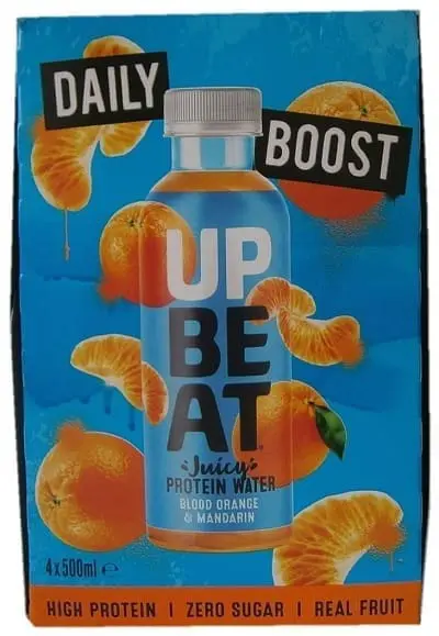 Upbeat Daily Boost Blood Orange & Mandarin Juicy Protein Water is made with real fruit, is high in protein, and contains zero sugar, but does have sweeteners. The product is described as spring water enriched with whey protein and B vitamins with fruit juice from concentrate enriched hydration for strength, energy and mental performance. According to the manufacturer, protein helps maintain muscle mass and normal bones; pantothenic acid (B5) supports normal mental performance; and vitamins B5, B6 and B12 support normal energy-yielding metabolism and help to reduce tiredness and fatigue. Each 500ml bottle provides 12g protein, as well as energising vitamins B5, B6, B7, B12, and is suitable for vegetarians. (UK)