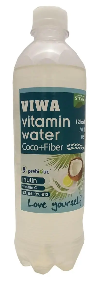 Viwa Vitaminwater Coco + Fiber Csökkentett Energiatartalmú, Szénsavmentes Üditöital (Coconut + Fiber Soft Drink) contains 12kcal per 0.1L, prebiotic, inulin, vitamin C and vitamins B3, B6, B7 and B12. This non-carbonated product is said to support a healthy and balanced digestive system, is made with fructose and stevia sweeteners, and is coconut-lemon flavoured. (Hungary)