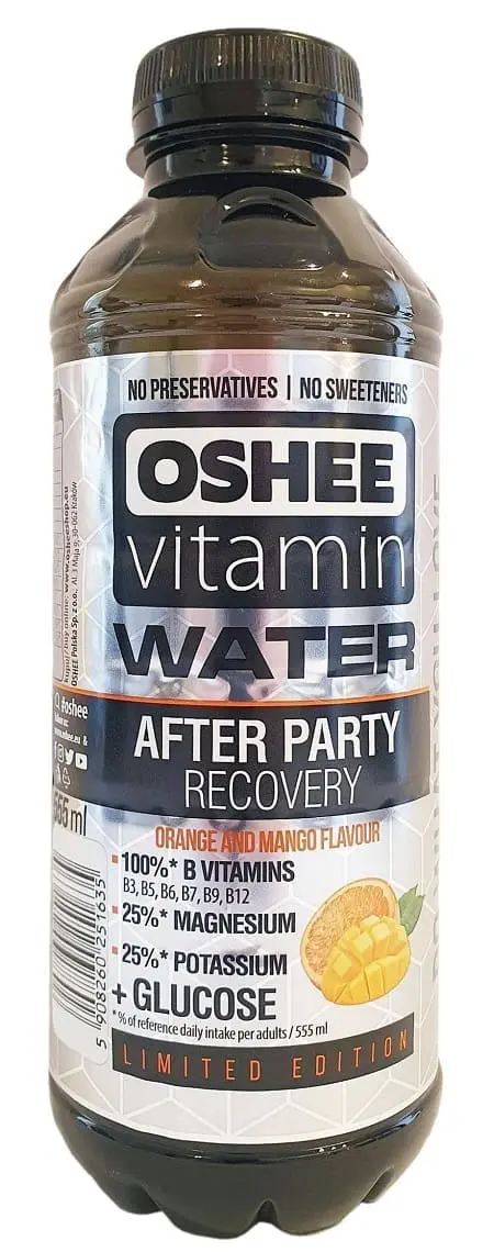 Oshee Vitamin Water Gaseerimata Apelsini- ja Mangomaitseline Vesi Vitamiinide ka Mineraalidega (Orange and Mango Flavour After Party Recovery Drink) contains 100% of the daily reference intake of B vitamins, including vitamins B3, B5, B6, B7, B9, and B12, 25% of magnesium and 25% potassium, as well as glucose. The limited edition pasteurised product is free from preservatives and sweeteners and retails in a 555ml bottle. (Estonia)