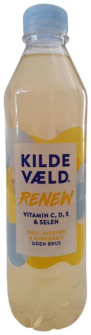 Kildevæld Renew Vand med Yuzu Ingefær & Gurkemeje Smag tilsat Vitamin C, D, E og Selen (Renew Water with Yuzu, Ginger & Turmeric Flavour with Vitamins C, D, E and Selenium) is a non -sparkling water with vitamins and minerals that contribute to the normal function of the immune system. The flavoured vitamin water retails in a 500ml pack. (Denmark)