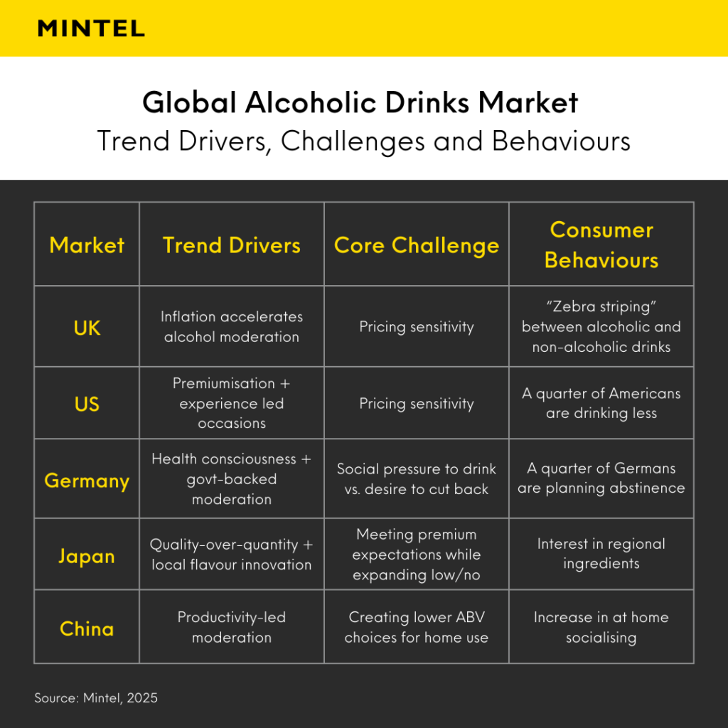 In the UK, economic challenge shapes consumer choices in alcohol consumption, while in the US, there is a strong rising appetite for premiumisation. Across Germany and China, the surge in health-consciousness is powering trends toward moderation, whereas in Japan, moderation is motivated less by health and more by a pursuit of productivity.