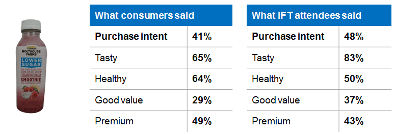 The results: While IFT attendees identified ‘tasty’ as one the product’s driving attributes, consumers and industry experts were close on the smoothie’s purchase intent, premium and whether it was a good value. Entire category purchase intent: 32%