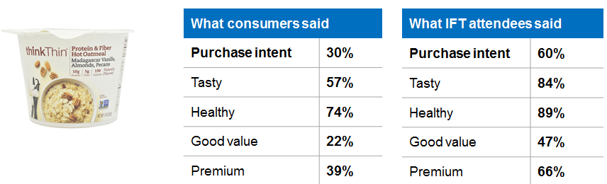 The results: Consumers and IFT attendees agreed the on-the-go oatmeal products was healthy, but differed wildly with categories such as purchase intent, good value and premium. Entire category purchase intent: 40%