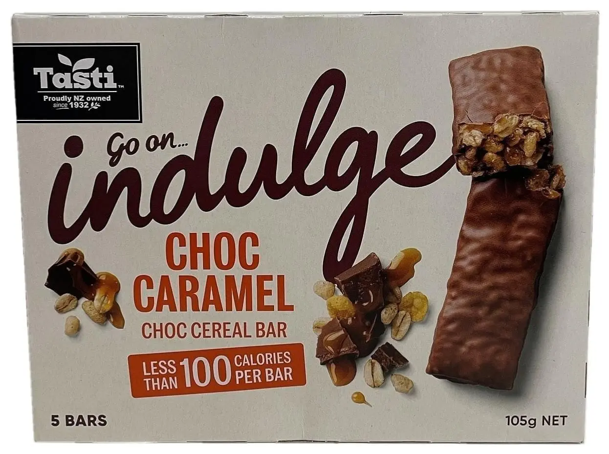 Tasti Go On… Indulge Choc Caramel Choc Cereal Bar (New Zealand) is described as crackly rice pops and crunchy rolled oats, licked in a lavish layer of caramel and smothered in a creamy choc coat. This product provides less than 100 calories per bar, is a source of fibre and retails in a recyclable pack containing five units and bearing the Weight Watchers Reimagined Loves logo.