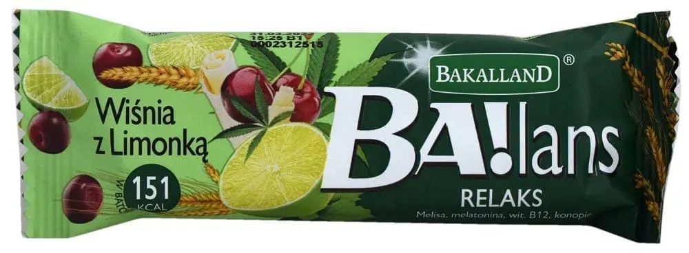 Bakalland Ba!lans Relax Cherry and Lime Bar (Poland) is said to blend the balance between sweet pleasure and a healthy snack. The product is a combination of crispy cereals, honey, high-quality nuts and dried fruits, and is described as a delicious bar with pieces of white chocolate, honey, lime flavour and freeze-dried cherry. It contains bioactive ingredients supporting relaxation, namely melatonin, lemon balm, vitamin B12, hemp seed extract, and does not contain palm oil, glucose-fructose syrup and hydrogenated fats.