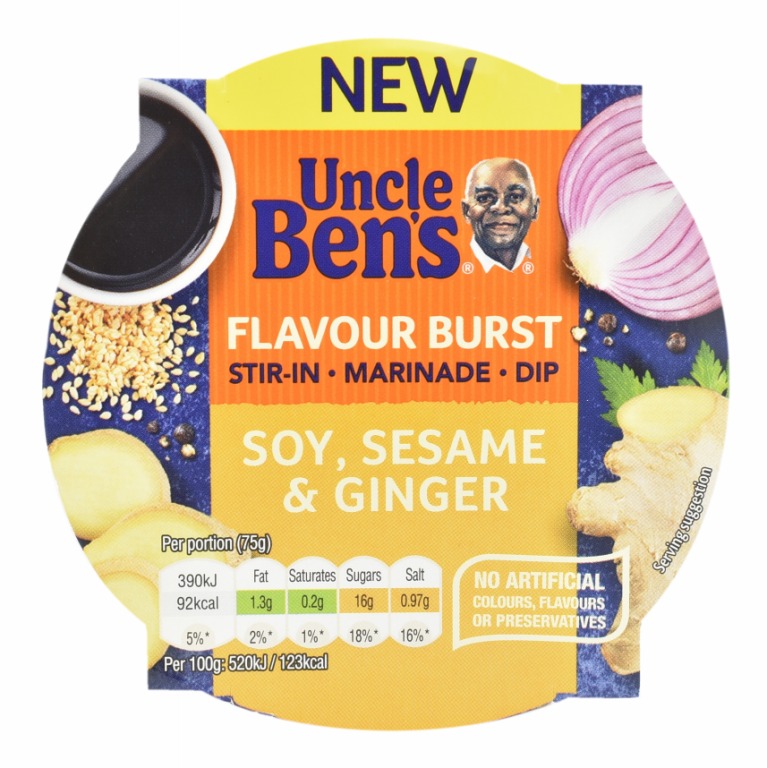Uncle Ben’s Flavour Burst Soy, Sesame & Ginger. This UK product is positioned as a marinade, cooking sauce and dip in one, playing up the product’s versatility while also offering clear use suggestions.