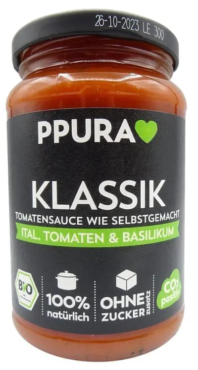 PPura Classic Tomato Sauce is said to be CO2 positive and according to the manufacturer, it is produced with 100% renewable energy, and uses short transport routes.