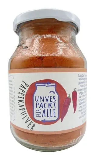 Unverpackt für Alle Paprikapulver (Paprika Powder) is described as Hungarian paprika with a spicy fresh taste from the Kalocsa region and retails in a plastic-free reusable jar.