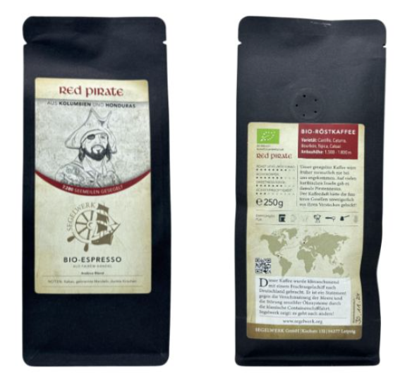 German brand Segelwerk has launched its Red Pirate Espresso made from grounds sourced from Colombia and Honduras. The brand extensively details taste descriptors including roast, body, sweetness and acidity through intensity scales on the pack to appeal to consumers.
