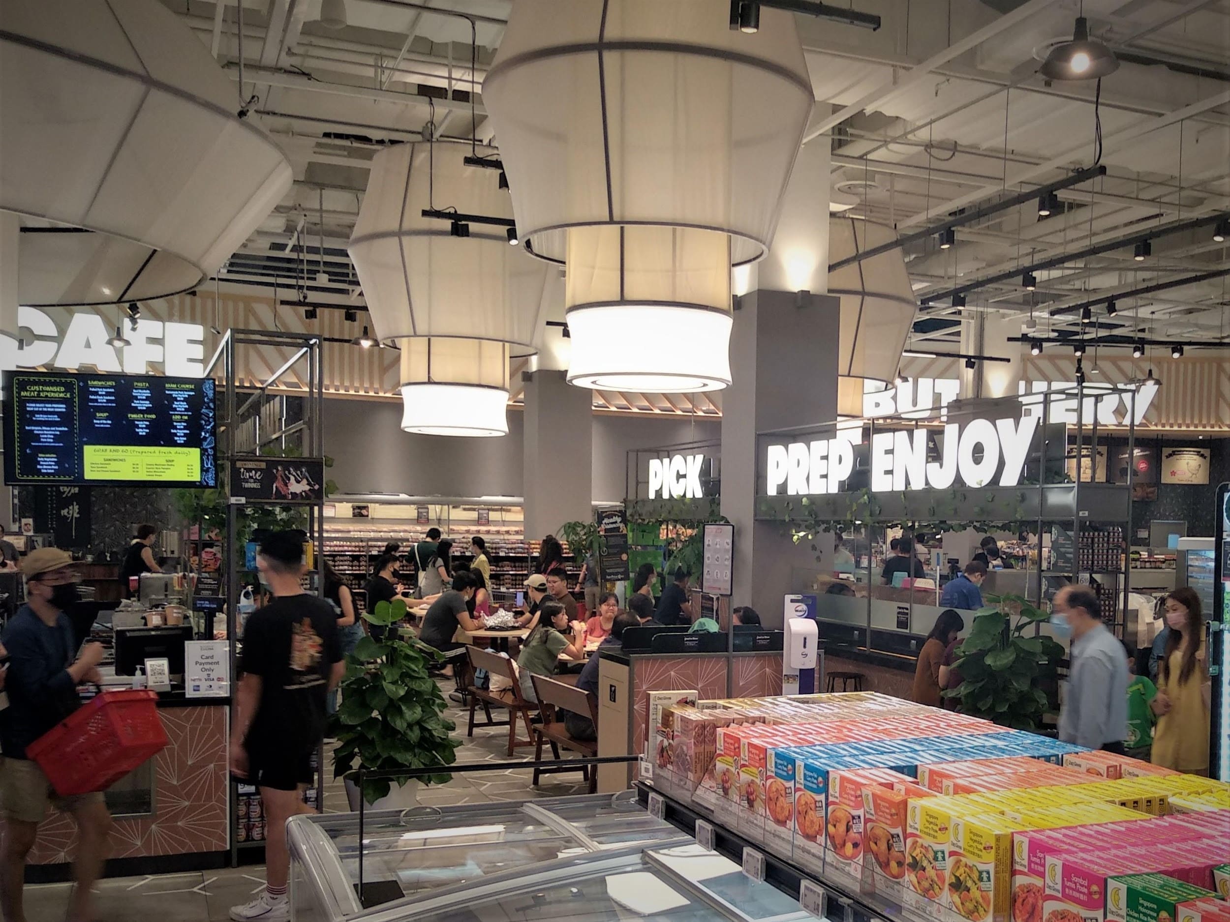 Singapore’s Fairprice Xtra VivoCity can offer inspiration here. This hypermarket concept combines a supermarket and a food hall, branded The Kitchen. Integrated right into the supermarket shopping area, The Kitchen concept includes a dining area and an open kitchen where chefs prepare and serve freshly cooked meals for shoppers to dine in.