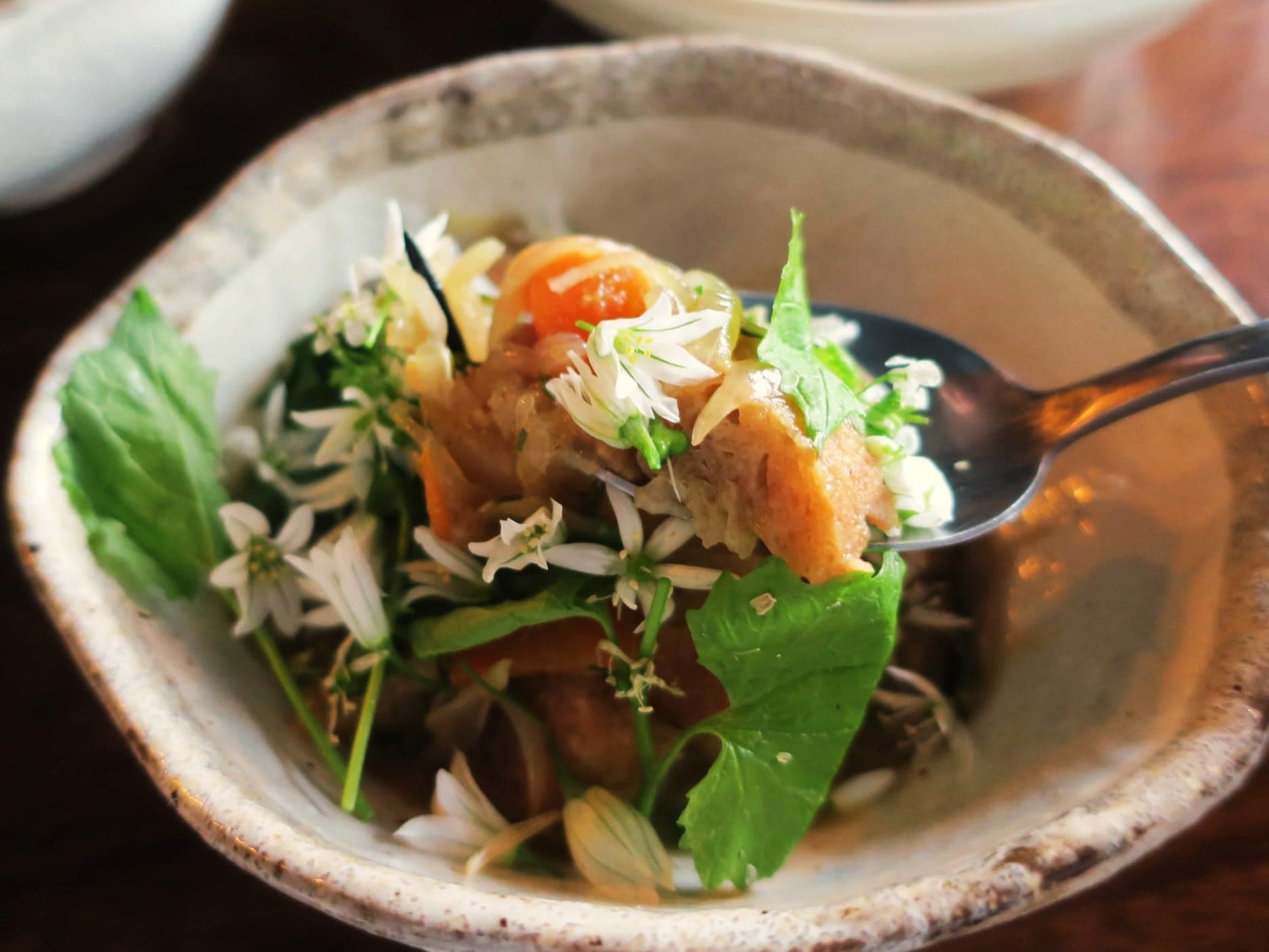 I ate a starter dish called ‘Old Allium Broth, Yesterday’s Bread, Aged Fat and Wild Herbs’, a collaboration dish between the independent restaurant Silver Lining in London’s Hackney and organisations FoodChain and Refettorio Felix. As part of its new FeastFairly initiative in May 2019, Foodchain is encouraging chefs to put edible food waste on the menu, with proceeds going to Refettorio Felix, which provides meals for vulnerable Londoners. For every onion soup sold, which costs £8 on the menu, Silver Lining will donate £3 to Refettorio Felix. Instead of chucking away stale bread, Silver Lining’s Head Chef Josh Dallaway doused it with a clear broth made of old onions, drizzled with aged animal fat and garnished with wild herbs and wild garlic flowers, foraged in his neighbourhood. What really sets this food waste dish apart is its presentation and the seasonality of the foraged garnishes. Making a food waste dish visually appealing with fresh, seasonal edible flowers and herbs tackles the “yuck factor” that some people may have about food made with “scraps”.