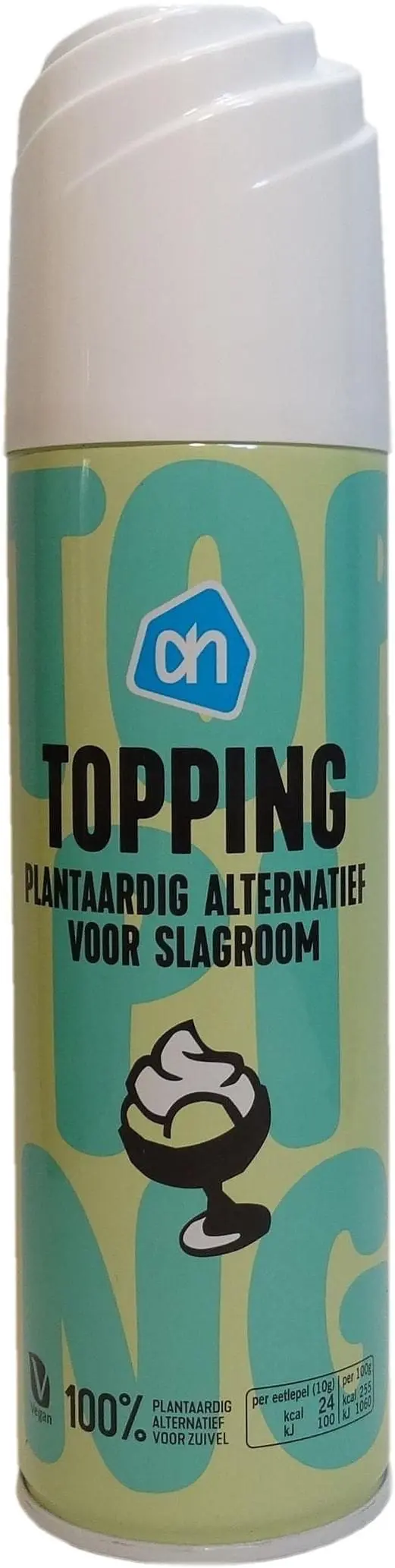 AH Plant-Based Topping Alternative for Whipped Cream is made with coconut oil for a gluten- and milk-free alternative to traditional whipped cream (Netherlands).
