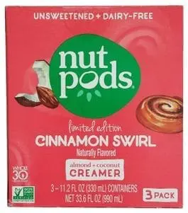 Nut Pods Cinnamon Swirl Almond + Coconut Creamer. This limited-edition vegan creamer is naturally flavored, is unsweetened and crafted from simple ingredients, and is described as a plant-based alternative to half-and-half (US).