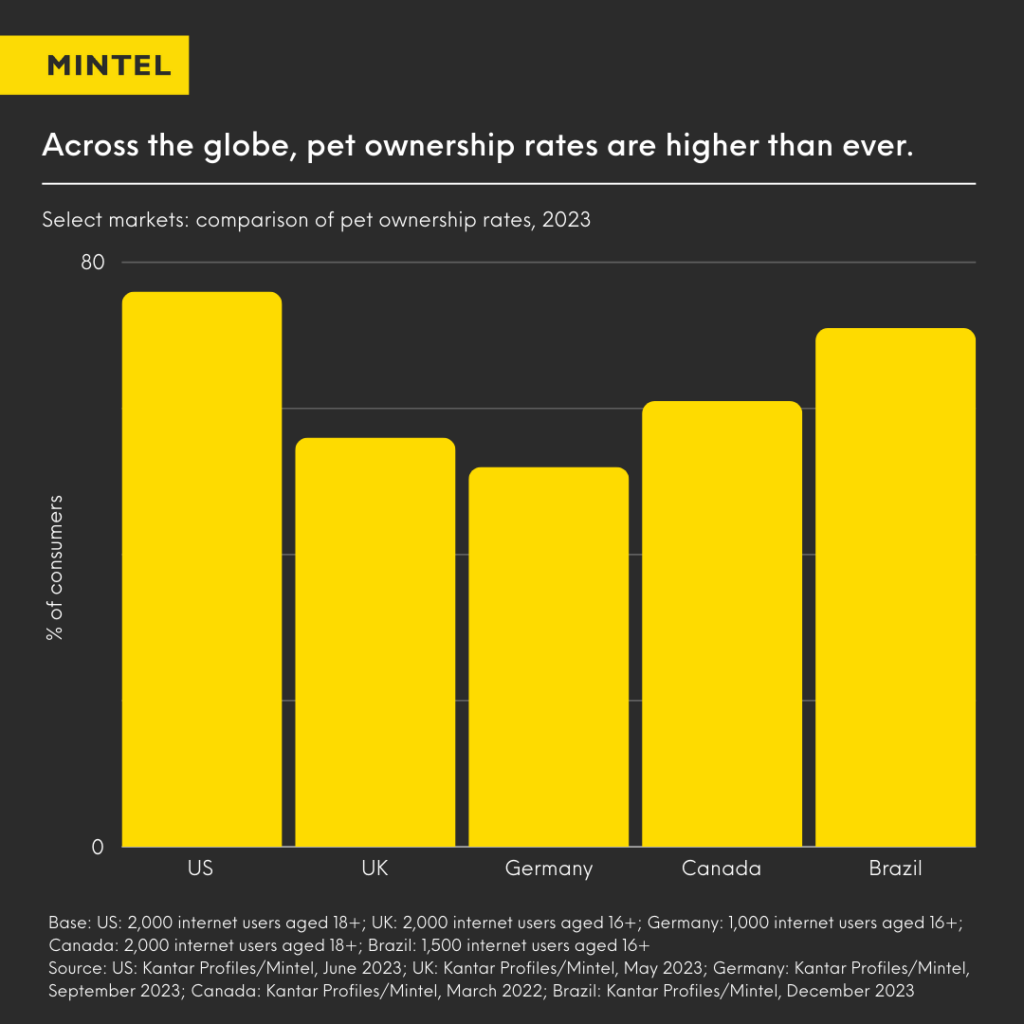 It’s official: the world has gone to the dogs (and cats, and hamsters, and mice, and axolotls). Across the globe, pet ownership rates are higher than ever. Mintel’s consumer research found that levels of pet ownership are highest in the US and Brazil, with a pet ownership rate of 73% and 71% respectively. It’s not just consumers in the Americas who have a fondness for a fuzzy friend, over half of consumers in the UK and Germany own a pet.