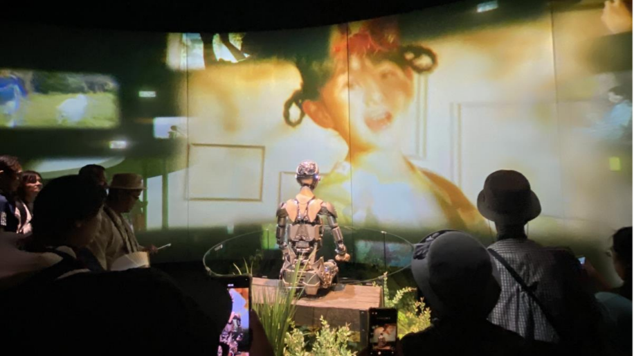 The null² Signature Pavilion, which was produced by media artist and Associate Professor at Tsukuba University, Yoichi Ochiai, was one of the most visibly striking to me. It looked like polished metal speakers, stacked on top of one another – solid yet fluid, its mirrored surface warping with the wind and sunlight. Inside, I entered a mirrored room where LED projections of digital humans emerged. They spoke of their lives and goals, responded to audience questions, – and embodied the blurring dialogue between humans and machines.