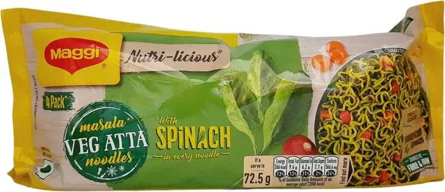 Maggi Masala Veg Atta Noodles with Spinach highlights nutritional information on the front of the pack (India). Source: Mintel GNPD