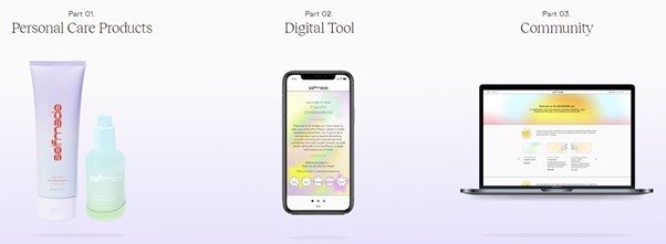 実際の製品は、美容液と、頭皮や体の角質を除去するスクラブで構成されていおり、デジタルサービスは、CommonRoomと銘打ったアプリ(ユーザーが自分の感情を記録・確認するためのアプリ)と公式サイト上で読むことのできる、コミュニティマガジンが用意されています。ブランドとそのコンセプトに対する信頼を得るために、Selfmadeはコラボレーションを積極的に行っています。メンタルヘルスの専門家(精神科医、臨床心理士、トラウマの専門家など)のサポートを得てブランドが作られていることをアピールしています。