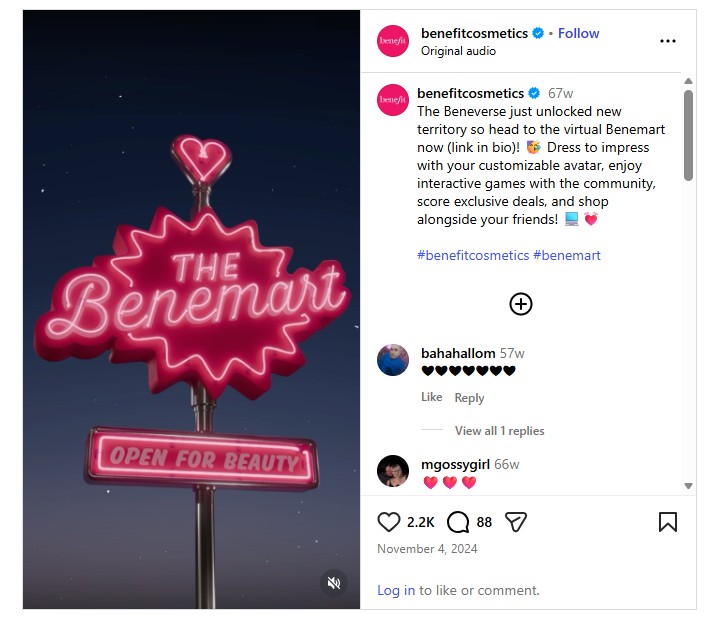 食料品店を模したBenefit Cosmeticsのデジタル・ポップアップストア。スーパーマーケットの通路に相当する場所が、ビューティー製品やキットで置き換えられています。出典:@benefitcosmetics(Instagram)