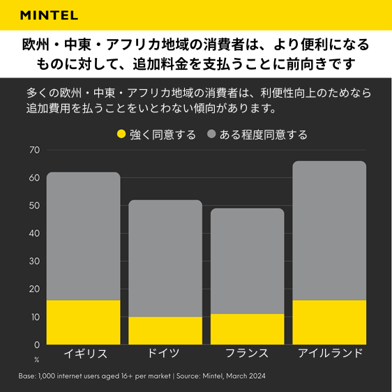 利便性は高く評価される一方で、それに対してプレミアム(割増価格)を支払う意思は、市場・属性・カテゴリーによって大きく異なります。欧州では、生活を楽にしてくれる商品には「多少高くても払う」と答える消費者が相当数存在します。