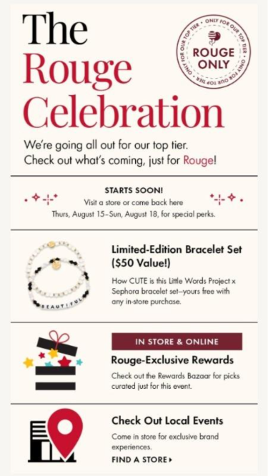 例えば、アメリカのコスメショップチェーンのSephoraは2024年8月、ロイヤルティプログラムの一環として「ルージュ・セレブレーション・イベント」を開催しました。これは Sephora のトップ顧客を対象とした4日間の体験型イベントで、店舗とオンラインでのアクティベーションを実施。「ルージュティア会員」はケラスターゼなどのブランドから限定特典を受け取り、オンラインマスタークラスに参加し、ジバンシィなどの企業の新商品をいち早く購入できました。