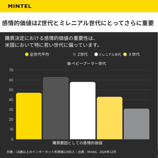 従来、製品の価値は価格や機能性で測られていましたが、現在では「ブランドへの信頼」や「倫理的な姿勢」が重要視されるようになり、感情的価値が加わっています。消費者が価値と定義するものは今や多面的であり、価格や利便性だけにとどまらず拡大しています:米国では47%の消費者が今後の消費行動において「感情的価値は品質や価格と同じくらい重要」と回答しており、今後さらにこの傾向は強まると予想されます。したがって、ブランドが感情に訴えるブランディング戦略の成功による市場機会を活用することは極めて重要であると言えます。